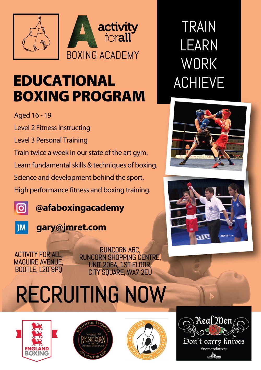 Registration and delivery of qualifications, experienced tutors with expert knowledge in their chosen sector delivering practical and theory-based lessons to give each young learner the best opportunity to pass on their chosen qualification, each learner will receive 121 support and guidance throughout their program. Maths and English lessons will be provided each week delivered by our qualified tutors, who have worked with all levels of learners from leaving school without any GCSEs to learners who need to re-sit their GCSEs after gaining a 3 previously in school, We will look after all enrolments of students, with reviews taking place every half term to ensure each learner is making the relevant progress and any personal issues or problems are being supported by either ourselves or our safeguarding team. AFA Boxing Academy offers an honest and trustworthy relationship with the local community with the interest of the young people at the heart of everything we do. We will also support the community & Runcorn Boxing Club with the programs they are involved in and in any way we can.